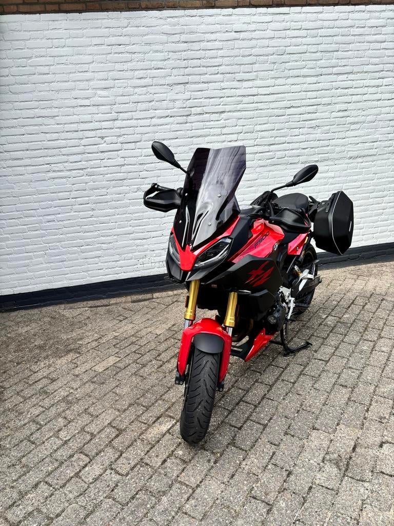 Deze bmw f900xr motorfiets staat te koop. Hij heeft een donker windscherm en zwarte zijkoffers. De motor heeft ook handkappen en een digitaal display. Hiernaast is deze full option met alle beschikbaa