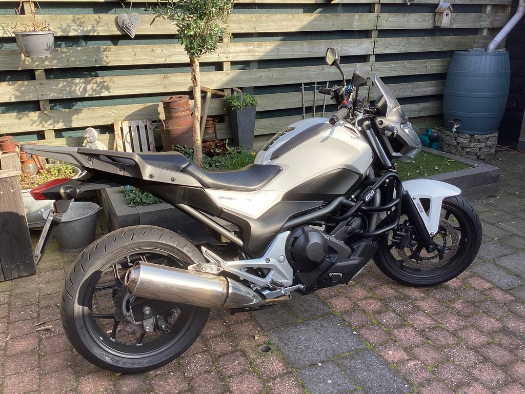 Honda nc700s, automaat uit 2013, met normale en een sportieve rijmodus. Kilometerstand is 19555 km. Kleur parelmoer wit. Voor- en achterband zijn vervangen bij de onderhoudsbeurt op 18568 km. Inclusie