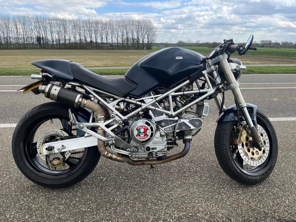 900 monster verbouwd na cafe racer.met de zelf gemaakte open luchtfilters in combinatie met de speciale hoge dempers en de droge koppeling heeft deze duc een mooie brute sound . Het spuitwerk is pas n