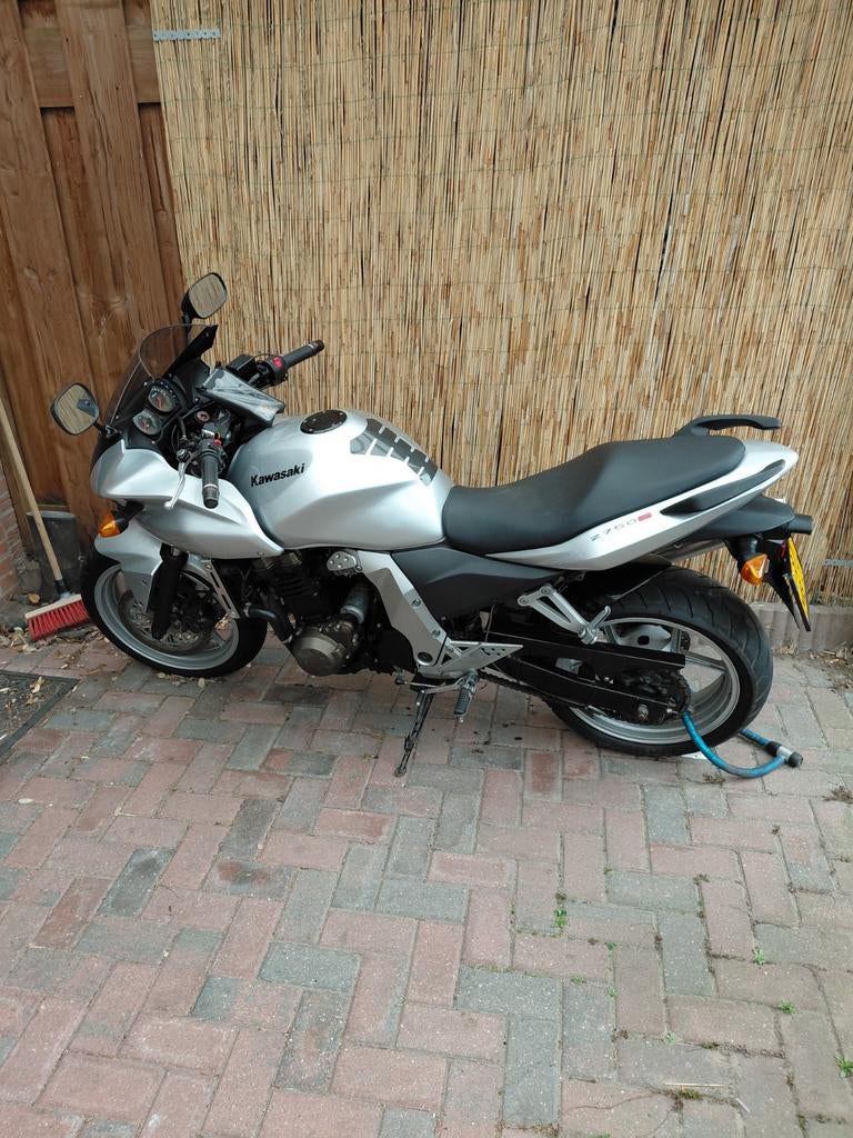 Een zilverkleurige kawasaki z750s motorfiets. De motor heeft een sportuitlaat en is voorzien van een middenblok, 750 cc en in zeer mooie staat.. Bouwjaar 2006. Mooie recht zit, ideale tourmotor. Geen