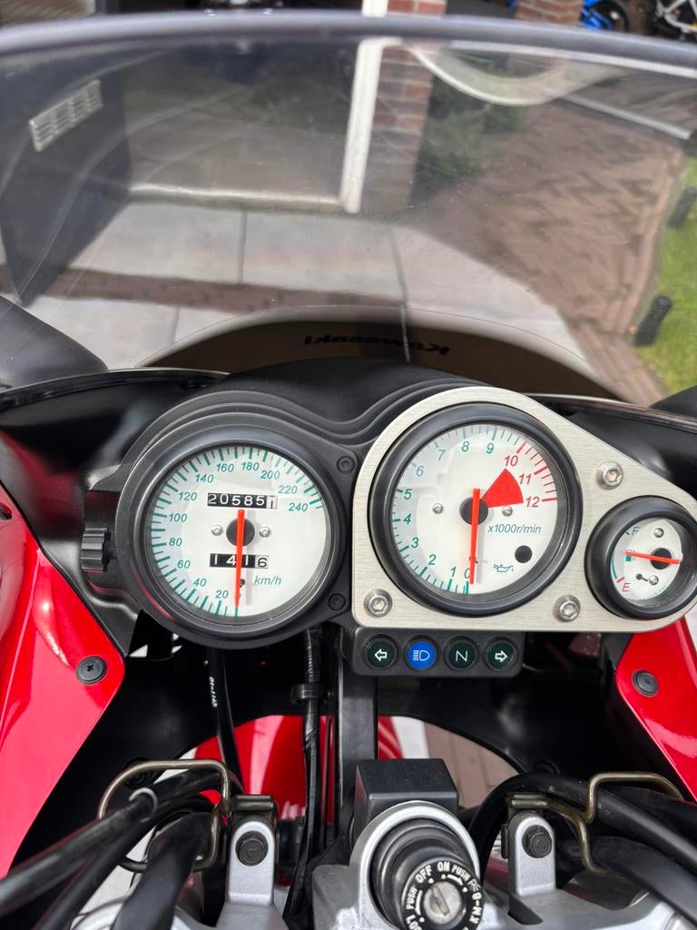 Kawasaki 750 zr7s gewicht 236 kg vermogen 56 kw/76 pk 19-02-2002 rood metallic een werkelijk prachtig exemplaar met nog maar 20.500 Km op de teller 2.000 Km geleden buurt gehad 2de eigenaar aangekocht