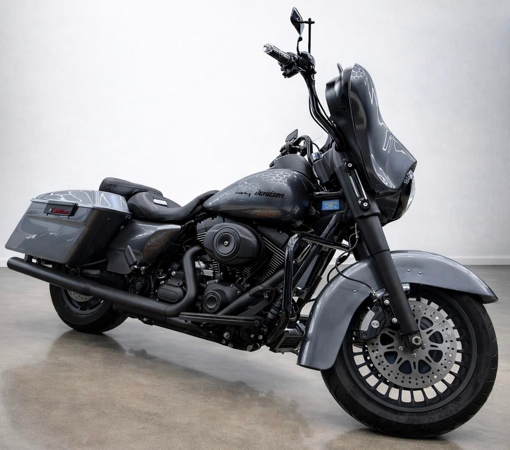 Super mooie dikke street glide 11” stuur voor fijnere zithouding nieuwe banden. Nieuwe schijven en blokken. Alles zwart gepoedercoat incl uitlaten cvo zadel zilvergrijs metallic aquanautic av bluetoot