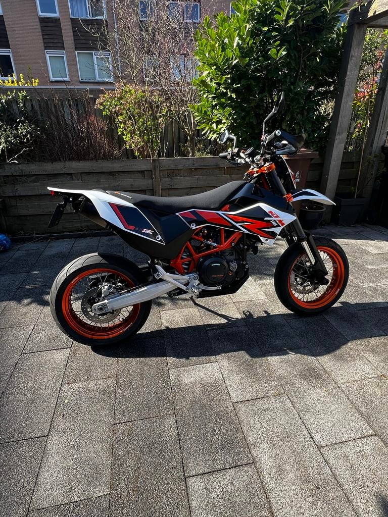 Ktm 690 smc r met 14665 km op de teller de km stand loopt nog wel op met het mooie weer de motor staat op kenteken op a2 maar is daadwerkelijk vol vermogen het is een super nette motor altijd goed ond