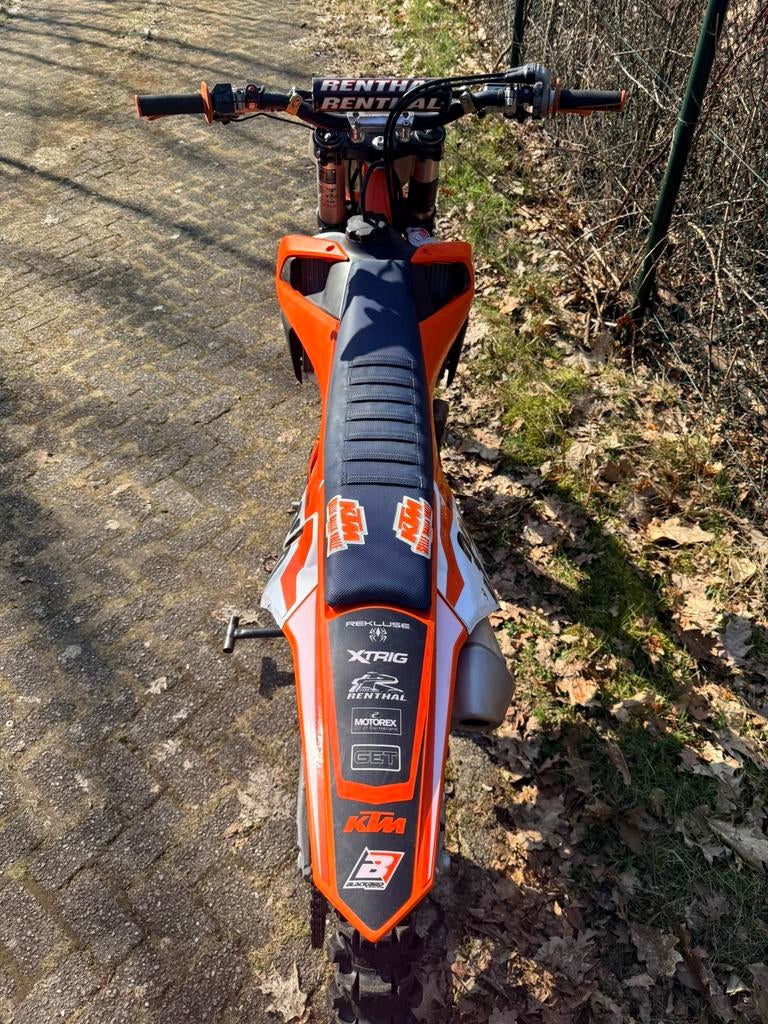 Aangeboden : ktm sxf 250 motor: 4 takt elektrische start banden zo goed als nieuw nieuwe olie / filter rijd en schakelt goed 25 uur geleden zuiger vervangen oranje frame twin wall stuur van laar afgev