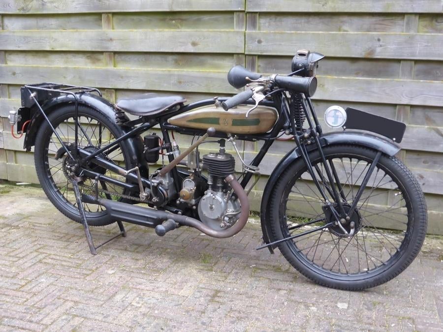 Wegens inkrimpen verzameling: triumph model w de luxe uit 1927. 277 Cc, 3 versnellingen. Nog in eerste lak en nikkel. Helemaal opnieuw opgebouwd met nieuwe banden, kettingen, kabels, rubbers. Rijklaar
