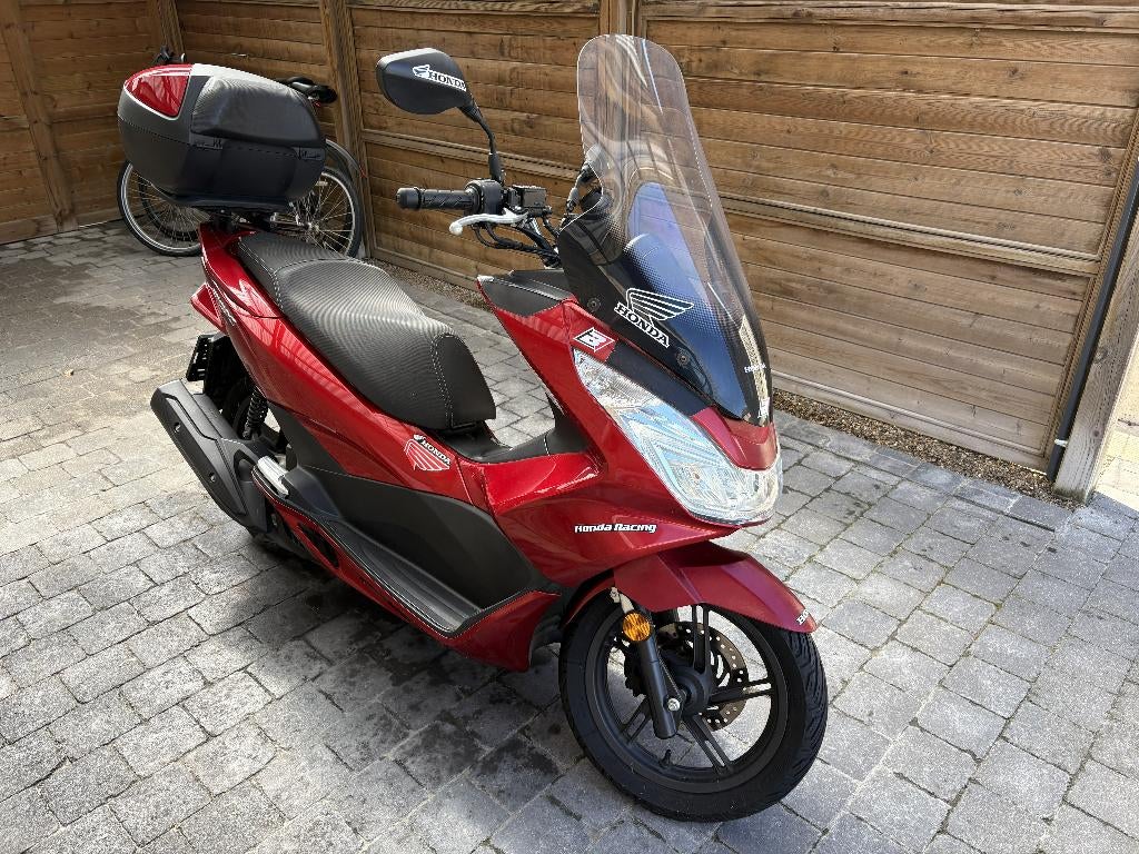 Honda pcx motorfiets, rood, slechts 6221 km, 125cc, benzine, 8.60Kw, max snelheid 94km/u, datum 1e inschrijving 13/4/2017.