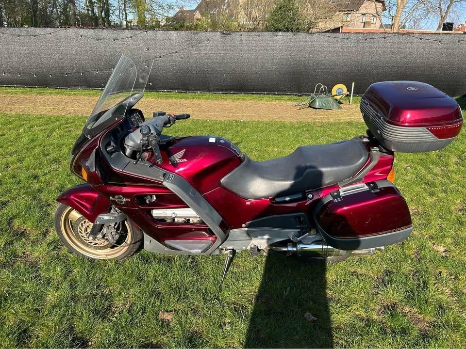 Honda pan-european 1100 st oersterke v4 met ingebouwde druppellader. In zeer goede staat ondanks zijn leeftijd, speciale gouden velgen. Kilometerstand bedraagt 88686 km, niet oplopend. 2 Helmen inbegr