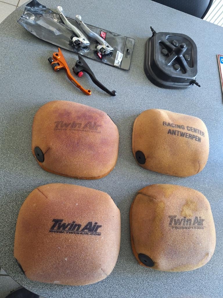 4 luchtfilters voor ktm sx(f) 2016 - 2022 en exc(f) 2017 - 2023 2 nieuwe remhendels brembo, oranje van de powerparts 2 koppelinghendels voor brembo, 1 gebruikte