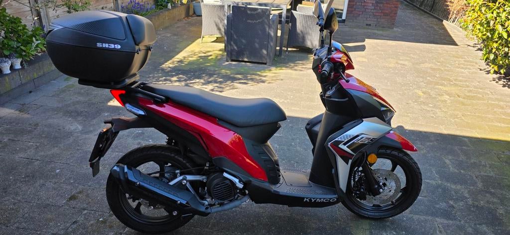 Kymco micare 125 scooter, bouwjaar 2025. De scooter heeft een kilometerstand van 2462 km en is rood met zwart van kleur. Er zit een nieuwe topkoffer op van 39 liter. De conditie is als nieuw. Onder he