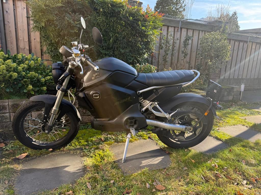 Black motorbike brand : super soco fully electric equivalent 125cc (same driving license needed) 1st registration 03/02/2023 5281kms 3 speeds - 60 to 100km range depending on speed no accidents one sc