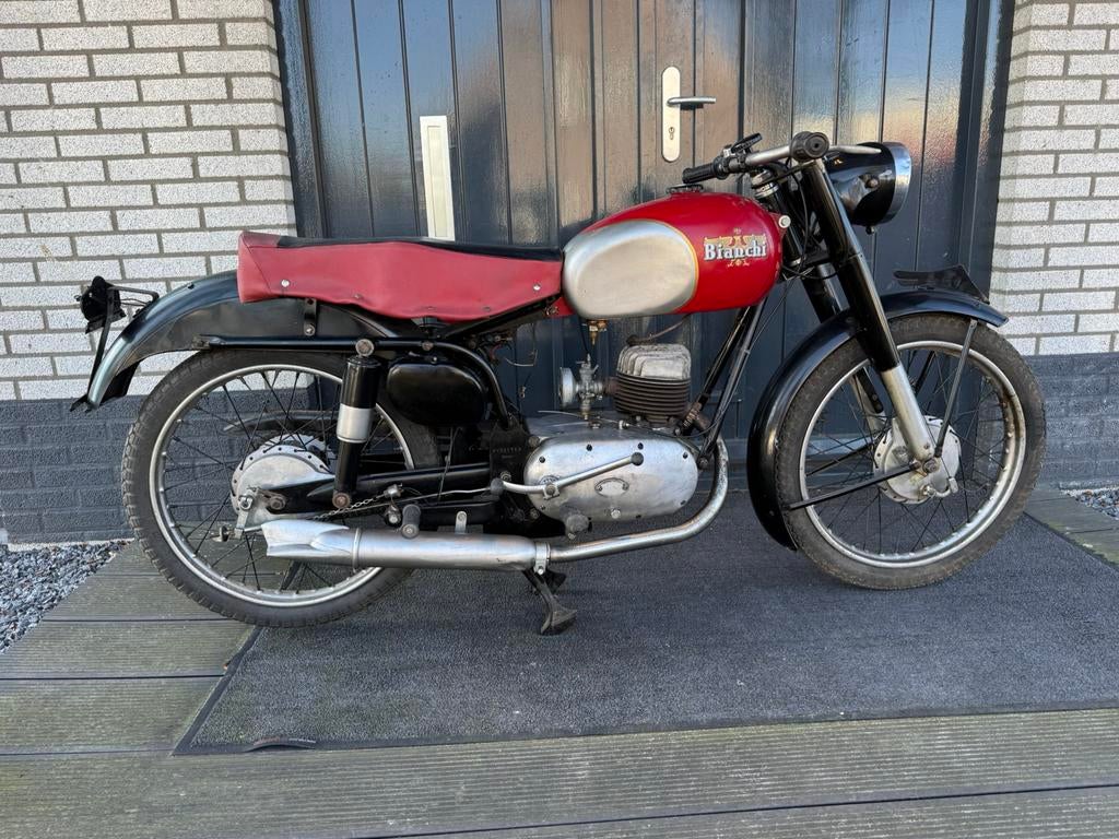Nette staat oldtimer motor bianchi bianchi 125 cc eind jaren 50 motor loopt aprilia logo’s op de kom lamp