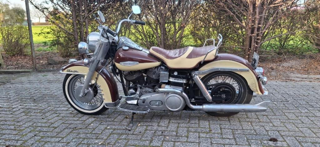 Harley davidson 1200 electraglide 1966 – early shovel zeldzaam exemplaar, benzinekraan nog aan de rechtekant!! 20 Jaar in mijn bezit geweest. De motor is momenteel in uitgeklede uitvoering zoals op de